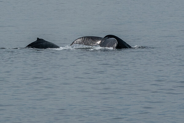 A mother Humpback Whale teaches her young whale how to dive in the marine waters of Washington State.